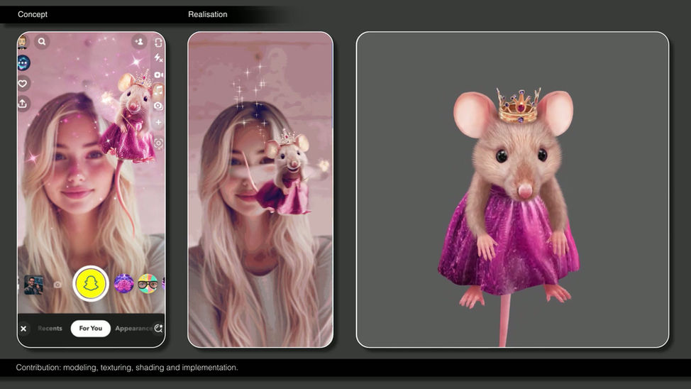 I create complete augmented reality experiences - from initial concept to final deployment - fully integrated in Lens Studio. I handle everything from 3D asset creation, animation, and shading to real -time implementation and optimization. My process covers all aspects of production, including modeling, texturing, shading and rigging with a focus on performance and visual quality. My work spans a wide range of 3D asset creation, from stylized to realistic.